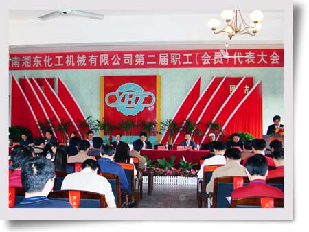 湖南湘東化工機(jī)械有限公司第二屆職工(會員)代表大會會場 湖南省經(jīng)貿(mào)委工會、株洲市總工會、攸縣總工會、湖南省網(wǎng)嶺監(jiān)獄工會、湖南省酒埠江電站、株洲市桃水煤礦、湖南化工機(jī)械學(xué)校等單位領(lǐng)導(dǎo)到會并致賀詞。